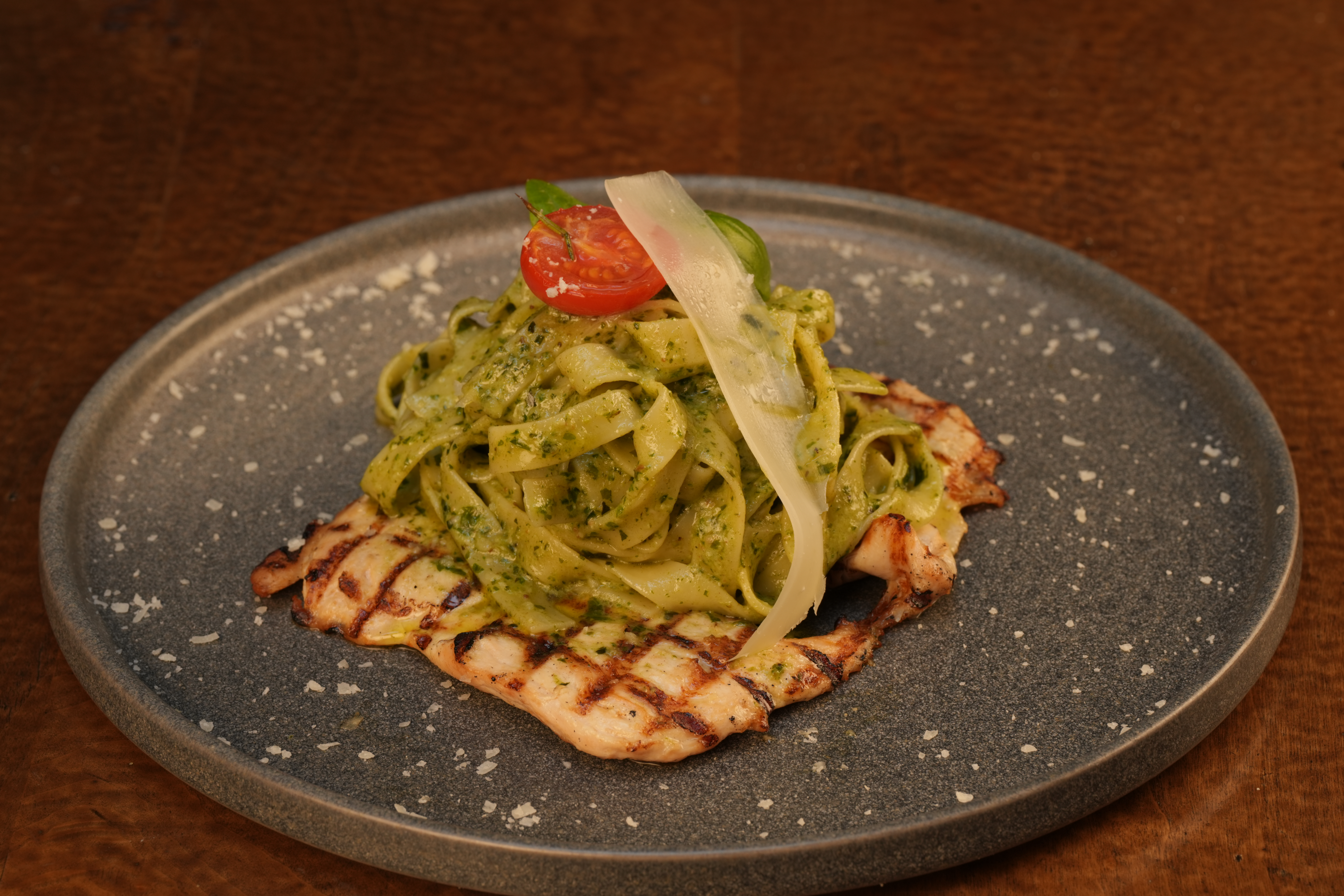 ızgara tavuk göğüsü, pesto soslu makarna ile servis edilir.