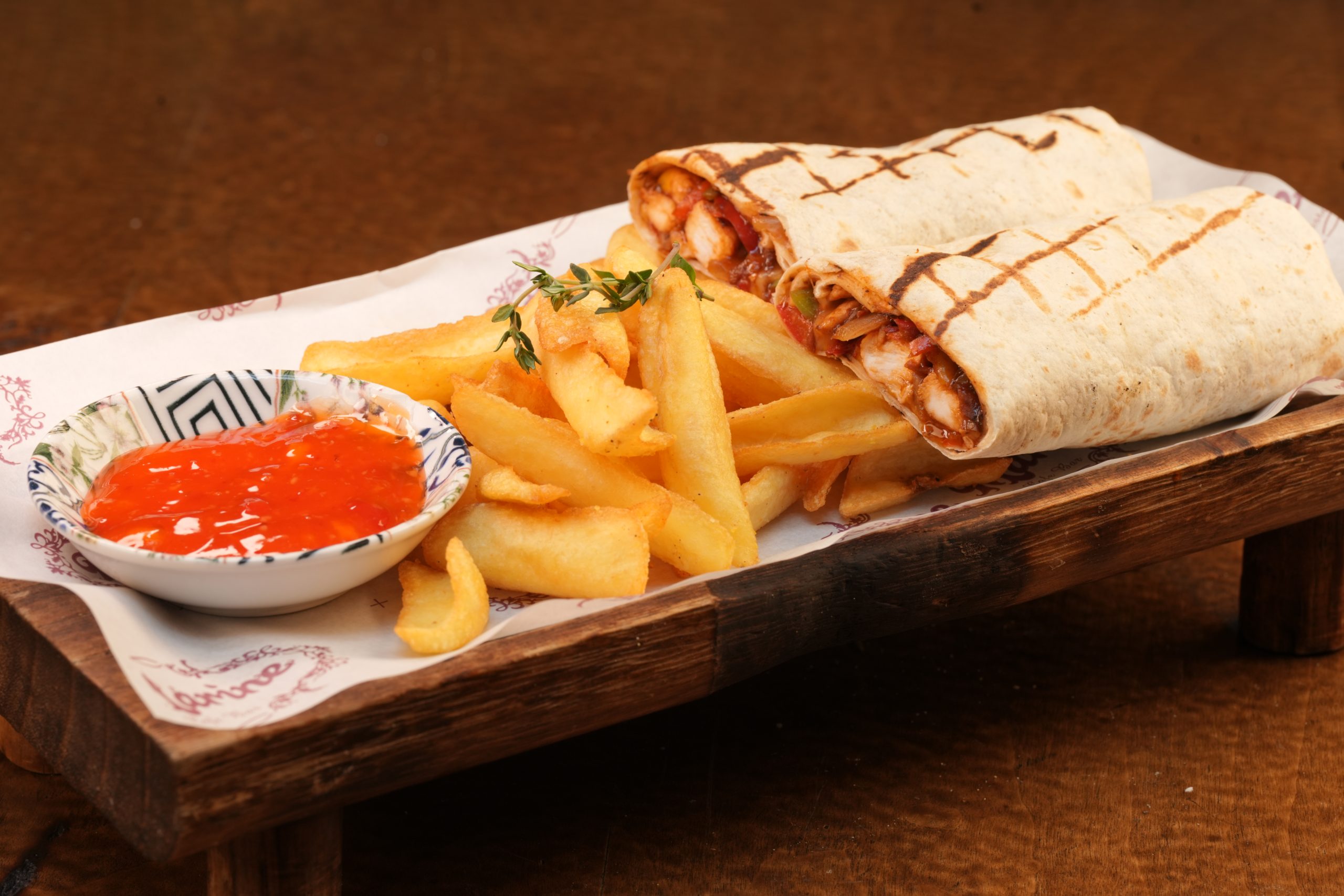 tavuk parçaları, renkli biberler, mantar, domates sos ve patates kızartması eşliğinde servis edilir.